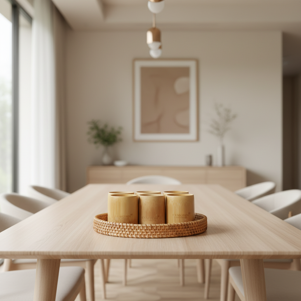 Thoughtfully designed for natural living and elegant hosting, the Bamboo Cup & Seashell Tray Set brings together sustainability and style. This set includes six medium-sized bamboo cups paired with a beautifully crafted seashell tray featuring a rattan base—creating a perfect blend of organic textures and refined aesthetics.