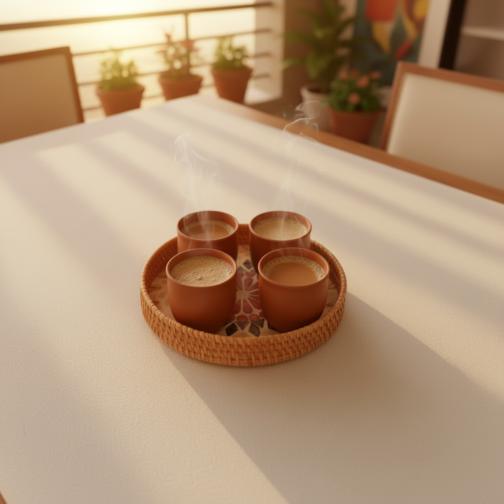 Perfect for serving chai, coffee, or warm beverages, the kulhads enhance the drinking experience with their earthy appeal, while the tray adds a sophisticated touch to presentation. Ideal for hosting guests or enjoying quiet moments, this set blends functionality with timeless style.