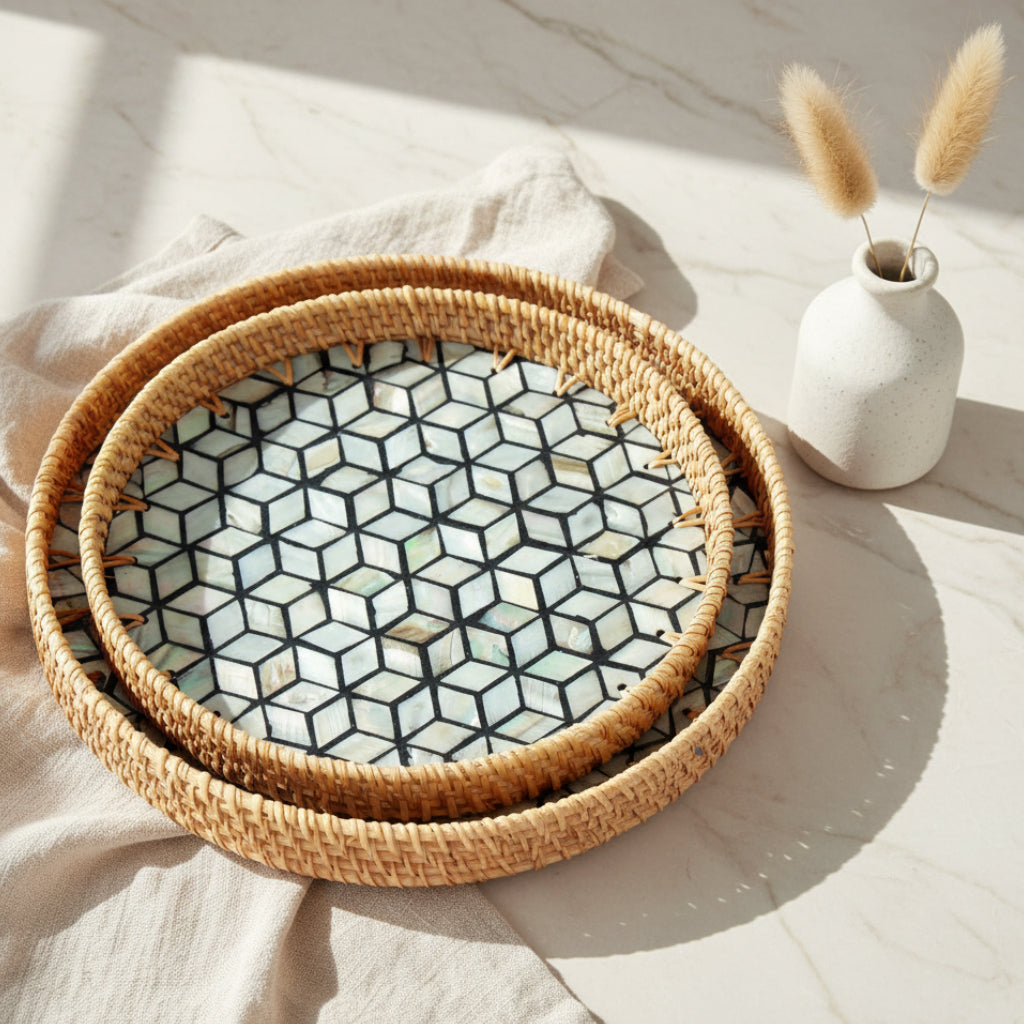 Refined and contemporary, the Geometric Wonder Round Seashell Tray brings modern sophistication to coastal-inspired living. Showcasing a striking geometric pattern on a smooth seashell base, this tray is meticulously crafted to suit elevated interiors. Its harmonious blend of structure, durability, and design makes it ideal for serving gourmet treats or styling as a statement décor piece. Created for those who admire clean lines and timeless form, this tray adds a bold yet elegant presence to any setting.